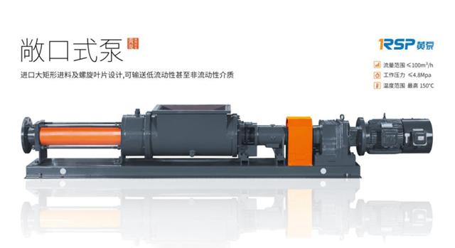 第二款黃泵敞口式單螺桿泵進(jìn)口腔體為矩形進(jìn)料斗設(shè)計(jì),內(nèi)裝有進(jìn)料螺旋葉片,可輸送高粘度、流動性差或非流動性介質(zhì),如脫水污泥等,工作壓力2.4Mpa,流量50m³/h。產(chǎn)品特點(diǎn)為以下幾點(diǎn)。