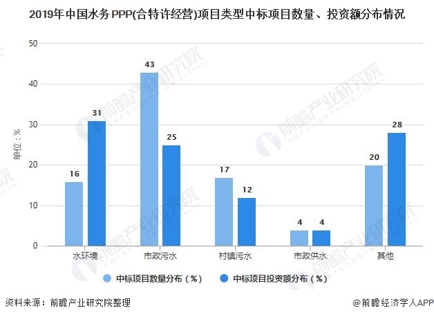 2019年,水務(wù)PPP(合特許經(jīng)營(yíng))中標(biāo)項(xiàng)目數(shù)量超過(guò)400個(gè),投資額近3000億。從項(xiàng)目數(shù)量分布上看,市政污水處理特許經(jīng)營(yíng)占主要部分,占比43%;從項(xiàng)目金額分布上看,水環(huán)境PPP占比最大,占比31%。