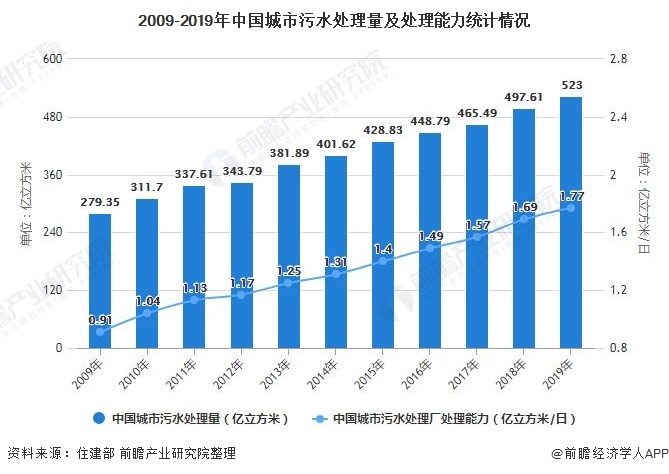 污水處理是目前水務(wù)行業(yè)重點(diǎn)關(guān)注的領(lǐng)域之一。由于城鎮(zhèn)化和經(jīng)濟(jì)發(fā)展需求,中國(guó)城市近年來(lái)污水產(chǎn)生量和處理量呈上升趨勢(shì)。從城市污水處理情況來(lái)看,截至2019年底,全國(guó)城市污水處理廠處理能力1.77億立方米/日,累計(jì)處理污水量523億立方米;全國(guó)地級(jí)及以上城市建成區(qū)排查出黑臭水體2899個(gè),其中2513個(gè)經(jīng)過(guò)處理已消除黑臭現(xiàn)象,消除比例達(dá)86.7%。