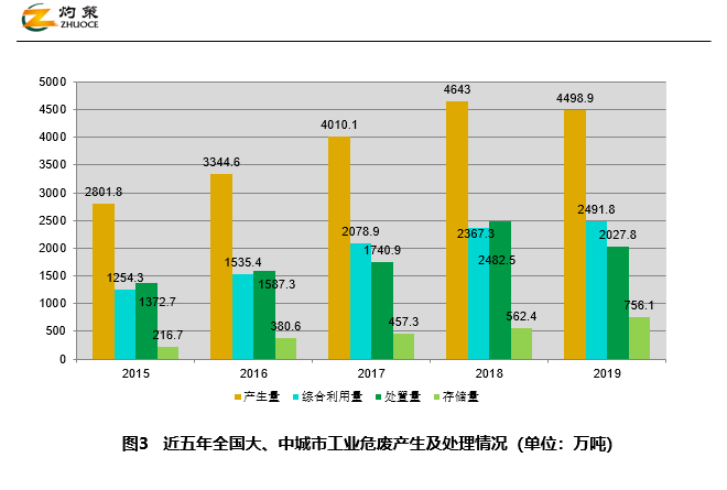2014-2018年,我國196個大、中城市工業(yè)危廢產(chǎn)量持續(xù)上升,綜合利用量和處置量增幅不大;2019年產(chǎn)生量有所回落,為4498.9萬噸,綜合利用量為2491.8萬噸,處置量2027.8萬噸,貯存量756.1萬噸,歷年貯存量持續(xù)上升。