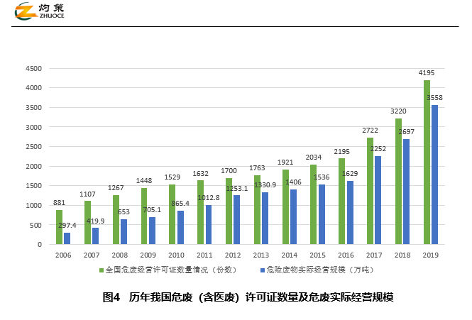 我國危廢處理行業(yè)的經(jīng)營規(guī)模在逐年增長,據(jù)《年報》,截至2019年底,全國危險廢物許可證持證單位共4195個,同比增長30.3%。其核準(zhǔn)收集和利用處置能力達(dá)到12896萬噸/年(含單獨(dú)收集能力1826萬噸/年);2019年度實(shí)際收集和利用處置量為3558萬噸(含單獨(dú)收集81萬噸)。與2006年相比,2019年危險廢物持證單位核準(zhǔn)收集和利用處置能力、危險廢物實(shí)際收集和利用處置量分別增長1709%和1098%。
