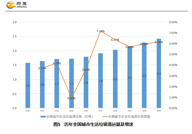 據(jù)統(tǒng)計,全國城市生活垃圾清運(yùn)量持續(xù)增長,2019年達(dá)2.4億噸,按近四年平均6%左右的增速計算,預(yù)測2020年達(dá)2.6億噸,2025年達(dá)3.4億噸。