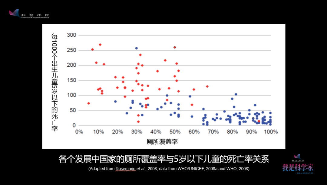 圖中最左邊的1000個兒童,5歲以下的死亡人數(shù)高達(dá)近300個,但如果是到了100%有衛(wèi)生廁所的這邊,死亡人數(shù)幾乎就是0了。這是用大數(shù)據(jù)證明了廁所和人類健康的關(guān)系——衛(wèi)生廁所的數(shù)量越多,兒童的死亡率越低。