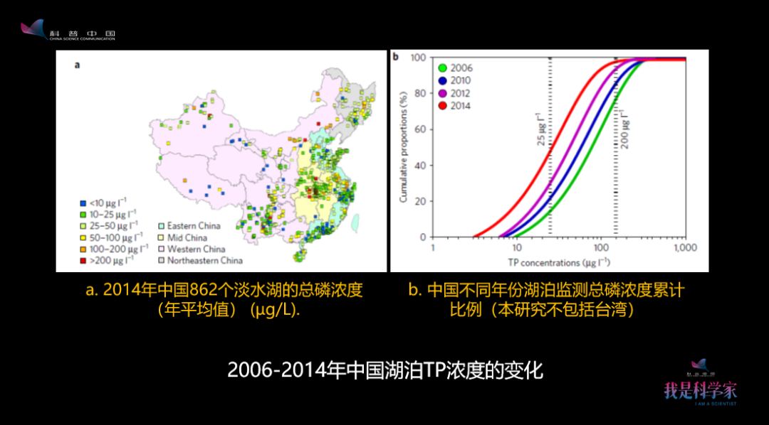 這個中國地圖表明我們有很多的污染物沒有處理好,就會進(jìn)入到湖泊里面。這個地方講的是磷會到我們的湖泊里。如果沒有處理好,氮也會到湖泊里去,也會到各種水體里去。