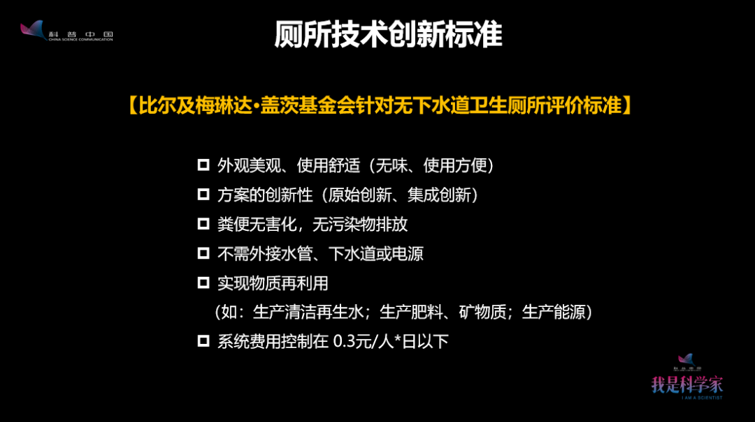 這是蓋茨基金會針對新型廁所提出的,從舒適度上、衛(wèi)生安全、資源化、經(jīng)濟(jì)上面提出了一系列的要求。你要創(chuàng)新,但需要滿足這些要求才能夠獲得基金會的支持。