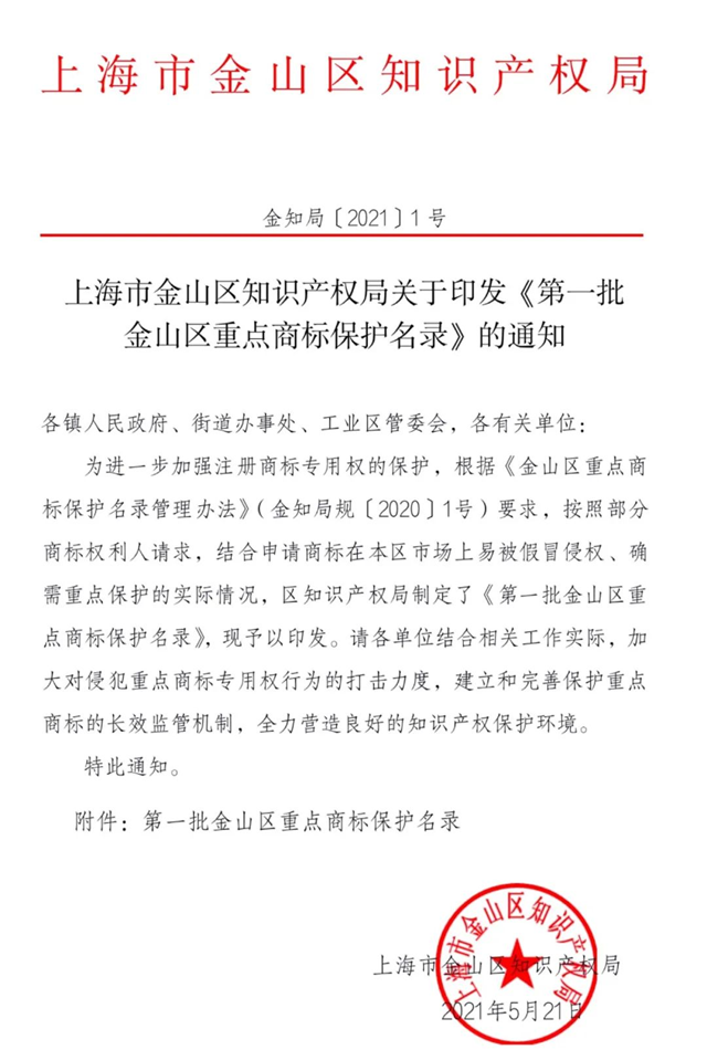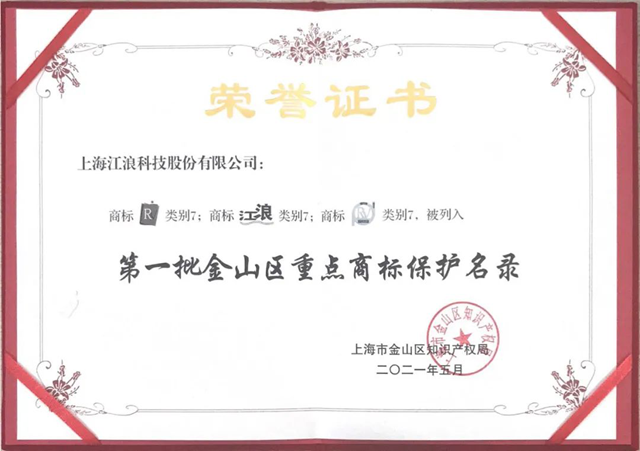 為進一步加強注冊商標專用權(quán)的保護,根據(jù)《上海市金山區(qū)重點商標保護名錄管理辦法》(金知局規(guī)〔2021〕1號)要求,上海市金山區(qū)知識產(chǎn)權(quán)局領(lǐng)導(dǎo)經(jīng)過數(shù)月評審討論,結(jié)合申請商標在市場上易被假冒侵權(quán)、確需重點保護的實際情況,于近日頒布《第一批金山區(qū)重點商標保護名錄》,上海江浪科技股份有限公司成功入圍,企業(yè)實力再獲權(quán)威認證!