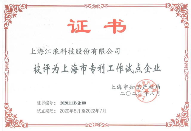 “上海市專利工作試點企業(yè)”是江浪科技繼獲評“上海市高新技術(shù)企業(yè)”、“上海市專精特新企業(yè)”之后獲得的又一項榮譽。