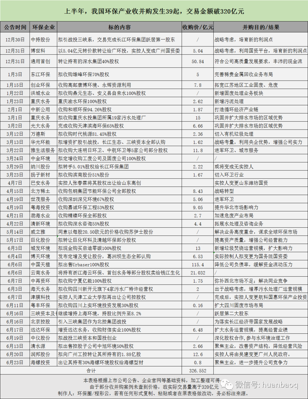 難道國(guó)資進(jìn)入,發(fā)生“混改”就一定會(huì)意味著原有民營(yíng)企業(yè)經(jīng)營(yíng)管理團(tuán)隊(duì)的重大調(diào)整,意味著新的企業(yè)會(huì)遭遇對(duì)國(guó)企嚴(yán)格管理制度的不適應(yīng),進(jìn)而導(dǎo)致企業(yè)喪失市場(chǎng)活力么?現(xiàn)在看來(lái),中持股份與長(zhǎng)江生態(tài)環(huán)保集團(tuán)的“無(wú)實(shí)控人”混改模式有可能給出不一樣的答案。但至于哪種模式更科學(xué),效果更好,目前還難以回答,為時(shí)尚早?;蛟S再過(guò)3年5年,時(shí)間會(huì)給出答案。第三,跨界并購(gòu)更加理性,資本更加謹(jǐn)慎。遙想6年前,那時(shí)的環(huán)保行業(yè)非常熱鬧,不僅惹得圈內(nèi)環(huán)保企業(yè)一路“買買買”向構(gòu)建大環(huán)保平臺(tái)邁進(jìn),更有諸多圈外非環(huán)保企業(yè)跨界而來(lái),被媒體戲稱為“野蠻人入侵”。2015年,是傳統(tǒng)行業(yè)跨界環(huán)保的元年,在看到環(huán)境產(chǎn)業(yè)成長(zhǎng)紅利后,他們紛紛大手筆跨界,落子環(huán)境產(chǎn)業(yè)。據(jù)媒體不完全統(tǒng)計(jì),當(dāng)年環(huán)保領(lǐng)域至少新添了40張新面孔,其中不乏葛洲壩集團(tuán)、中國(guó)石化、中信集團(tuán)、中國(guó)中車、中國(guó)中鐵這樣的大型國(guó)企。2016年則是跨界布局環(huán)境產(chǎn)業(yè)的爆發(fā)期,在這一年間,許多實(shí)力強(qiáng)勁的企業(yè)紛紛跨界環(huán)保,業(yè)內(nèi)一片嘩然,有人認(rèn)為他們進(jìn)入是好事,給環(huán)保行業(yè)帶來(lái)大量資金,也有人認(rèn)為他們會(huì)進(jìn)一步擠壓環(huán)保企業(yè)利潤(rùn),未來(lái)廝殺會(huì)越演愈烈。還有人認(rèn)為,入場(chǎng)者眾,出局者亦增多,未來(lái)五年才是環(huán)保并購(gòu)的驗(yàn)證期,那些盲目入場(chǎng)、沒(méi)有技術(shù)和資本能力的企業(yè)將在“大洗牌”中出局。果然,狂歡只是暫時(shí)的,而危險(xiǎn)則隨之而來(lái)。到了2018年,跨界環(huán)境產(chǎn)業(yè)的并購(gòu)僅有6起,外界資本對(duì)環(huán)境投資愈發(fā)理性和謹(jǐn)慎,絕大多數(shù)并購(gòu)都是環(huán)保同行之間的兼并,橫向產(chǎn)業(yè)鏈下上游并購(gòu)多發(fā)。從標(biāo)的來(lái)看,相對(duì)2015年水務(wù)和流域治理,2018年危廢和環(huán)衛(wèi)則成為資本爭(zhēng)寵的標(biāo)的。到了今年上半年,在39起并購(gòu)案例中,真正意義上的跨界并購(gòu)僅有3起,一個(gè)是從事稀土深加工的內(nèi)蒙企業(yè)北方稀土以8.43億元價(jià)格,收購(gòu)了包鋼集團(tuán)旗下的節(jié)能環(huán)保公司全部股權(quán),謀求轉(zhuǎn)型;另一個(gè)是生產(chǎn)建筑板材企業(yè)揚(yáng)子新材以自有資金收購(gòu)濱南股權(quán)51%股份,切入環(huán)衛(wèi),瞄準(zhǔn)城市公共服務(wù)。還有一個(gè),就是開篇提到的主業(yè)做生物殺蟲劑的錢江生化,并購(gòu)云南水務(wù)旗下的污水處理廠運(yùn)營(yíng)權(quán)。第四,海外并購(gòu)降至冰點(diǎn),出海淘金熱已褪。隨著外界資本跨界環(huán)保熱情減退,近兩年海外并購(gòu)也在逐年降溫,降至冰點(diǎn)以下。前幾年,在國(guó)家“一帶一路”戰(zhàn)略下,環(huán)保頭部企業(yè)為了快速補(bǔ)齊技術(shù)、服務(wù)運(yùn)營(yíng)的短板,曾經(jīng)掀起一個(gè)出?!疤越稹钡臒岢薄?/span>北控、首創(chuàng)、中國(guó)天楹、錦江環(huán)境、云南水務(wù)、國(guó)禎環(huán)保、永清環(huán)保、格林美等優(yōu)秀環(huán)保上市企業(yè),都曾出于各種戰(zhàn)略考慮,尋求海外并購(gòu)。其中北控曾在2016年斥資14.38億歐元(約125.48億港元),收購(gòu)德國(guó)最大垃圾發(fā)電EEW全部股權(quán),成為中國(guó)對(duì)德最大并購(gòu)交易。然而近兩年來(lái),國(guó)內(nèi)環(huán)保龍頭企業(yè)則鮮有海外并購(gòu),即使有,也沒(méi)能掀起太大的浪花。據(jù)筆者觀察,今年上半年39起并購(gòu)案例中,竟然沒(méi)有一例是龍頭環(huán)保企業(yè)出海并購(gòu)國(guó)際友商,反倒是中國(guó)天楹拋售海外資產(chǎn),兩大法企威立雅和蘇伊士合并。從并購(gòu)就能看出,兜兜轉(zhuǎn)轉(zhuǎn)不過(guò)幾年間,環(huán)保行業(yè)就已經(jīng)走了一波人,來(lái)了一撥人。行業(yè)格局正在發(fā)生巨變,一個(gè)新的時(shí)代已經(jīng)拉開大幕。附:上半年我國(guó)環(huán)保行業(yè)收并購(gòu)案例詳情:
