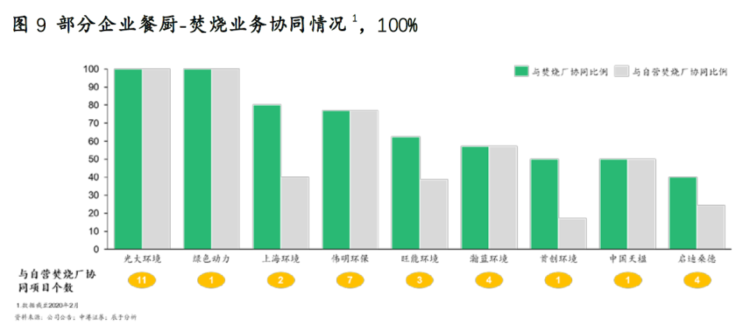 在垃圾分類全面推行的大背景下,這些大型固廢企業(yè)正利用協(xié)同優(yōu)勢(shì)降維打擊(見圖9)。一方面,垃圾焚燒主業(yè)帶給這些企業(yè)資金和政府資源雙重優(yōu)勢(shì);另一方面,協(xié)同處置帶來降本增效,可以幫助這些企業(yè)降低財(cái)務(wù)壓力:在收入端,協(xié)同優(yōu)勢(shì)在于餐廚沼渣余電上網(wǎng);而在成本端,除可節(jié)約土建、人工等成本外,干濕垃圾處置的發(fā)電設(shè)備、除臭系統(tǒng)、滲濾液處理系統(tǒng)、蒸汽供熱系統(tǒng)等也可共用,從而降低折舊攤銷成本。