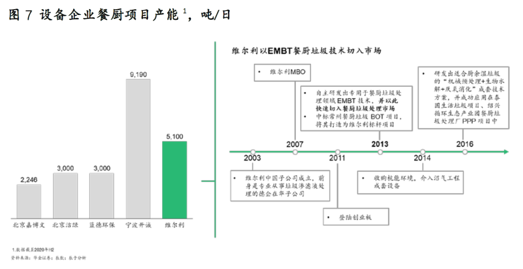 展望“十四五”,我們認(rèn)為有兩股力量不容忽視,餐廚垃圾處理行業(yè)真正激烈的市場(chǎng)競(jìng)爭(zhēng)也許才剛剛開始,一方是以寧波開誠、維爾利為代表的企業(yè),他們進(jìn)入市場(chǎng)較早,主要提供技術(shù)或設(shè)備,同時(shí)具有一定的產(chǎn)能規(guī)模和先發(fā)品牌優(yōu)勢(shì)(見圖7)。