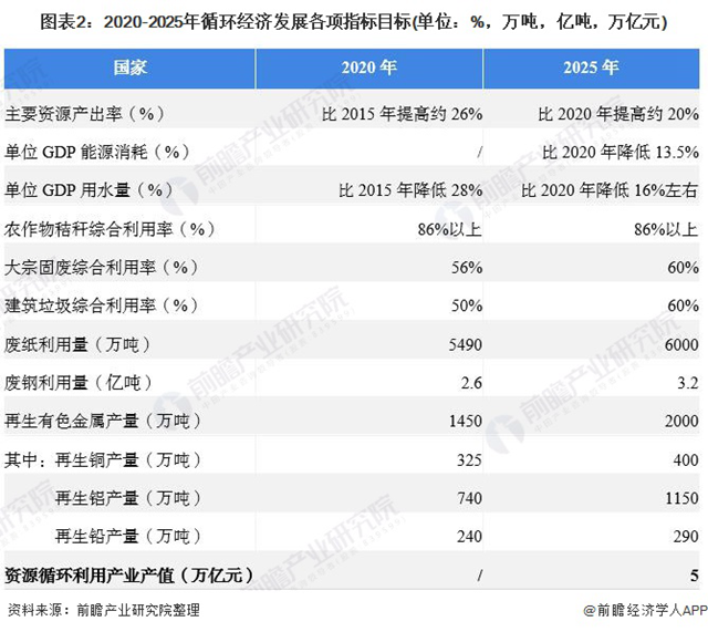 到2025年,我國循環(huán)經(jīng)濟(jì)發(fā)展各項(xiàng)指標(biāo)將有所提升,包括主要資源產(chǎn)出率比2020年提高約20%,單位GDP能源消耗、用水量比2020年分別降低 13.5%、16%左右等。2025年,我國資源循環(huán)利用產(chǎn)業(yè)產(chǎn)值將達(dá)到5萬億元。