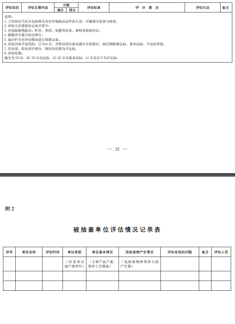 (二)地方評(píng)估。省級(jí)生態(tài)環(huán)境部門對(duì)市級(jí)生態(tài)環(huán)境部門的評(píng)估,可結(jié)合本省(區(qū)、市)實(shí)際,參照《評(píng)估指標(biāo)》附表 1 執(zhí)行,具體指標(biāo)可適當(dāng)調(diào)整。各級(jí)地方生態(tài)環(huán)境部門按照《評(píng)估指標(biāo)》附表 2、3 對(duì)產(chǎn)廢單位和經(jīng)營單位進(jìn)行評(píng)估,并填寫《評(píng)估情況記錄表》(見附 2)。固體廢物管理、環(huán)境執(zhí)法、環(huán)境影響評(píng)價(jià)、排污許可等部門要對(duì)危險(xiǎn)廢物規(guī)范化環(huán)境管理評(píng)估工作做好必要的政策指導(dǎo)。有條件的地區(qū),可以采取購買第三方服務(wù)等方式,為危險(xiǎn)廢物規(guī)范化環(huán)境管理評(píng)估工作提供技術(shù)支撐。