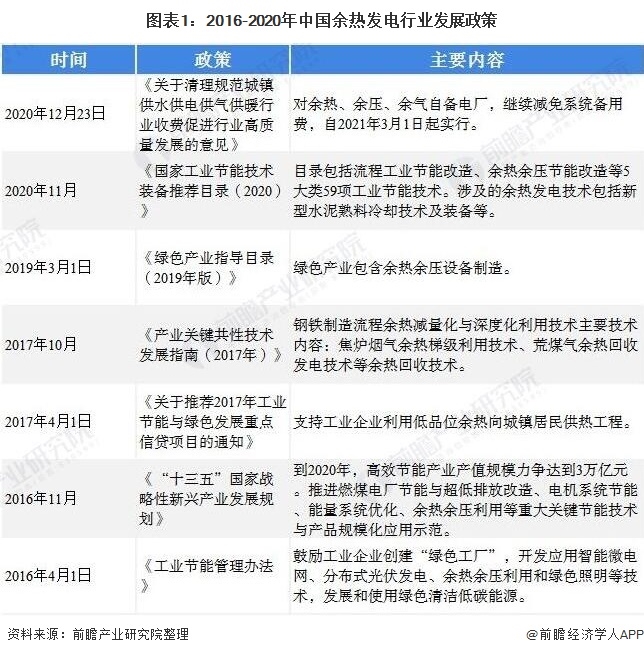 2020年發(fā)布的《關(guān)于清理規(guī)范城鎮(zhèn)供水供電供氣供暖行業(yè)收費(fèi)促進(jìn)行業(yè)高質(zhì)量發(fā)展的意見》和《國(guó)家工業(yè)節(jié)能技術(shù)裝備推薦目錄(2020)》分別從費(fèi)用減免與技術(shù)推薦的角度推動(dòng)余熱發(fā)電行業(yè)發(fā)展。