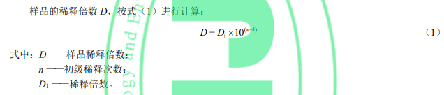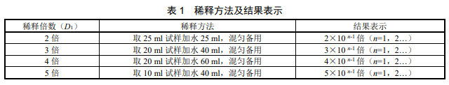 用量筒(6.6)取第 n−1 次初級(jí)稀釋的試料,按照表 1 的稀釋方法由小到大逐級(jí)按自然倍數(shù)進(jìn)行稀 釋,每稀釋 1 次,混勻后按目視比色方法(8.3)觀察,直到剛好與水(5)無(wú)法區(qū)別時(shí)停止稀釋,記錄稀釋倍數(shù) D1。