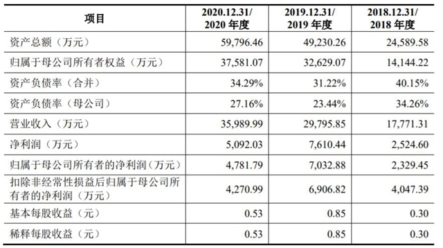 2018 年至 2020 年,實樸檢測實現(xiàn)營業(yè)收入分別為1.78億元、2.98億元、3.6億元;同期實現(xiàn)歸屬于母公司所有者的凈利潤分別為2,329.45萬元、7,032.88萬元、4,781.79 萬元。