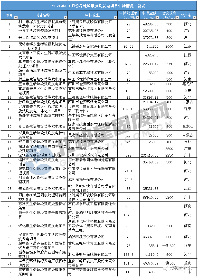 附:1-6月全國垃圾焚燒發(fā)電項(xiàng)目中標(biāo)信息匯總(如有遺漏,敬請諒解)
