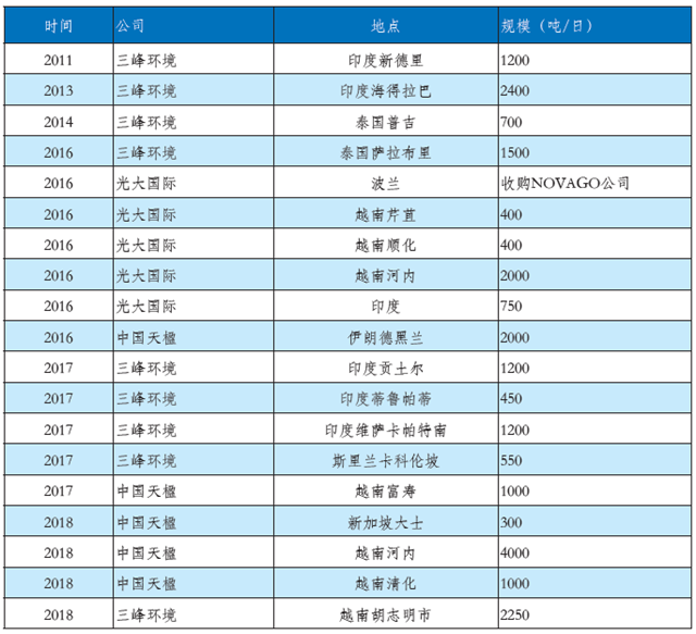在固廢領域,具備自主設備制造能力的三峰環(huán)境、光大國際、中國天楹等企業(yè)也已經(jīng)成功邁出國際化的堅實一步。以三峰環(huán)境為例,2013年投資并運營多座生活垃圾填埋場、危險廢物處理廠、垃圾資源化回收利用廠以及生活垃圾發(fā)電廠。同年,隆企集團贏得印度首批垃圾發(fā)電項目,確定與三峰環(huán)境合作,并采用三峰環(huán)境提供的設備和技術方案。目前三峰環(huán)境的技術設備已應用到美國、印度、埃塞俄比亞、泰國、斯里蘭卡、越南、巴西等七個國家的垃圾焚燒發(fā)電項目。