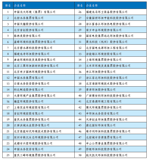 2020中國環(huán)境企業(yè)50強榜單