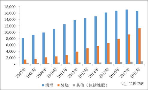 2018年,我國城市生活垃圾無害化處理量達(dá)到28,778萬噸,其中填埋處理量16,700萬噸,焚燒處理量11,226萬噸,其他(包括堆肥)處理量851萬噸。