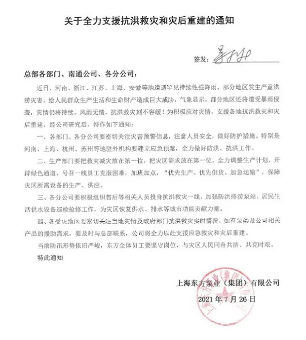面對(duì)災(zāi)情,上海東方泵業(yè)(集團(tuán))有限公司董事長(zhǎng)吳永旭先生第一時(shí)間提出要求:搶先救災(zāi)減災(zāi),全力調(diào)整生產(chǎn)計(jì)劃,開(kāi)辟綠色通道,優(yōu)先保障災(zāi)區(qū)所需給排水設(shè)備的生產(chǎn)、供應(yīng);各分公司要組織人員積極投身抗洪救災(zāi)一線,加強(qiáng)防洪排澇泵站、居民生活供水設(shè)備巡檢搶修工作;各駐外機(jī)構(gòu)要積極聯(lián)系相關(guān)管理部門(mén),了解災(zāi)區(qū)實(shí)際需求,只要災(zāi)區(qū)有需要,上海東方泵業(yè)(集團(tuán))有限公司一定全力以赴支援應(yīng)急救災(zāi)和災(zāi)后重建。