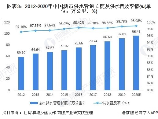 2019年我國城市供水管道長度達92.01萬公里,供水普及率達98.78%,2020年,我國城市供水管道長度約為96.41萬公里,供水普及率約為98.98%。
