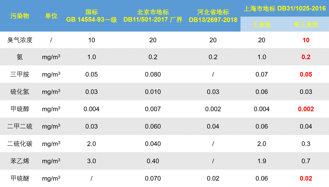 大多數(shù)國家和地區(qū)的臭氣濃度標(biāo)準(zhǔn)用于污染管理指導(dǎo),規(guī)定臭氣濃度標(biāo)準(zhǔn)的應(yīng)用范圍不盡相同。不同地區(qū)使用的臭氣濃度由于測(cè)量方式差異導(dǎo)致單位不同:如澳大利亞使用OU、荷蘭使用OUE/m3、美國使用D/T,韓國使用OC,而國際上對(duì)臭氣濃度的定義是一致的,因此1OU=1OU/m3 = 1OUE/m3 = 1OC= 1D/T。上海市《惡臭(異味)污染物排放標(biāo)準(zhǔn)》(DB31/1025-2016)規(guī)定的非工業(yè)區(qū)臭氣濃度及氨、三甲胺、甲硫醇、甲硫醚等組分濃度在國內(nèi)均最嚴(yán)。