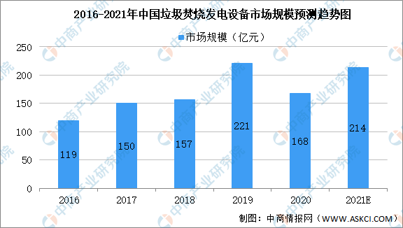 焚燒爐作為垃圾焚燒處理系統(tǒng)最核心的設(shè)備,其設(shè)計需充分考慮垃圾停留時間、燃燒溫度、煙氣在爐內(nèi)的停留時間及紊流等因素,從而達到完全燃燒、控制惡臭及二惡英類物質(zhì)產(chǎn)生的目的。目前國內(nèi)外應(yīng)用較多、技術(shù)比較成熟的生活垃圾焚燒爐主要包括流化床焚燒爐、爐排爐型焚燒爐等。2020年,垃圾焚燒發(fā)電設(shè)備市場規(guī)模約為168億元。預(yù)計2021年我國垃圾焚燒發(fā)電設(shè)備市場規(guī)??蛇_214億元。