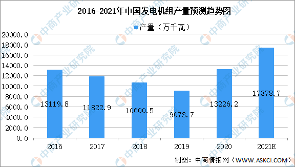 一般我們常見的發(fā)電機組通常由汽輪機、水輪機或內(nèi)燃機(汽油機、柴油機等發(fā)動機)驅(qū)動,可再生新能源包括核能、風(fēng)能、太陽能、生物質(zhì)能、海洋能等。數(shù)據(jù)顯示,我國發(fā)電機組產(chǎn)量呈波動趨勢,2020年我國發(fā)電機組產(chǎn)量達13226.2萬千瓦,預(yù)計2021年我國發(fā)電機組產(chǎn)量可達17378.7萬千瓦。