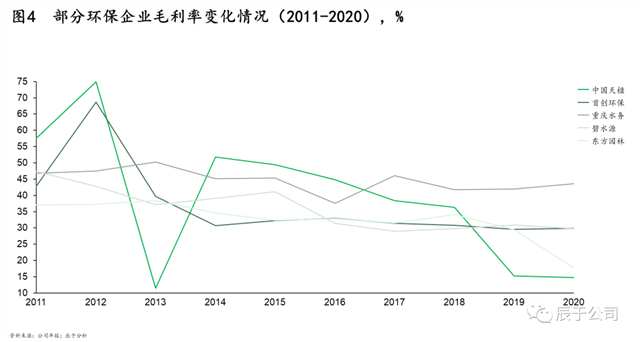 因此,地方政府一方面想辦法壓低項目盈利水平降低投入,一方面尋求其他“合法”融資渠道解困。近年來大型生態(tài)環(huán)保企業(yè)的盈利水平逐步下降印證了項目盈利降低的趨勢(見圖),盈利就幾個點,融資成本極低的大型國企、央企在競爭中處于優(yōu)勢,幾個點的融資成本決定了項目的成與否;尋找融資渠道下,地方生態(tài)環(huán)保集團(tuán)應(yīng)運而生,對跨市統(tǒng)籌、投資公益性回報比較差的項目等,將起到積極的作用。