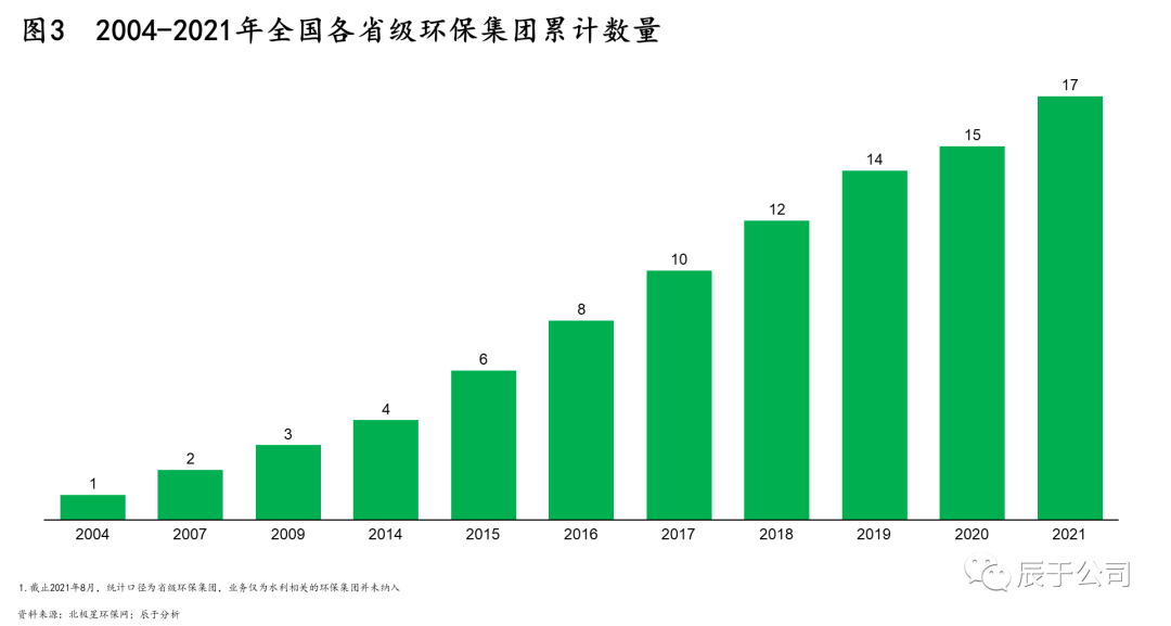 從“十二五”開(kāi)始,就有地方生態(tài)環(huán)保集團(tuán)成立,但“十三五”中后期至今頻率明顯變高。例如,初步統(tǒng)計(jì)已有超過(guò)20家省級(jí)生態(tài)環(huán)保集團(tuán),大多都是在“十三五”后期成立的,大概每年都會(huì)有2~3家(見(jiàn)圖3)。
