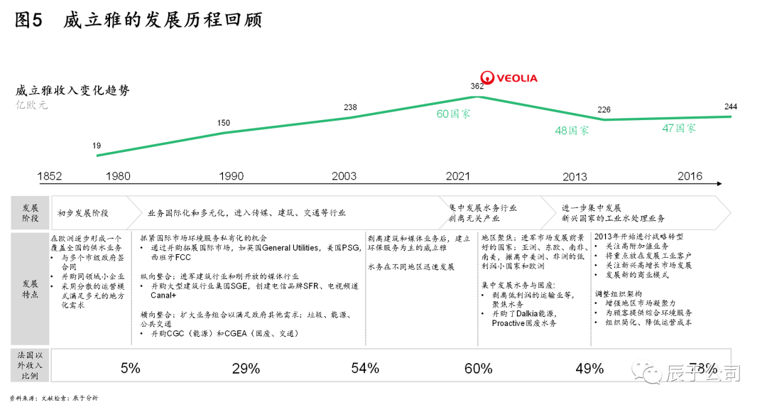 任何大企業(yè)的長(zhǎng)成都不是一日之功,全球生態(tài)環(huán)保巨頭威立雅的發(fā)展之路照樣坎坷,歷經(jīng)160年發(fā)展,直到上世紀(jì)80年代后才真正開(kāi)始走上快速發(fā)展的道路,經(jīng)歷了之后30年的擴(kuò)張(見(jiàn)圖5)。
