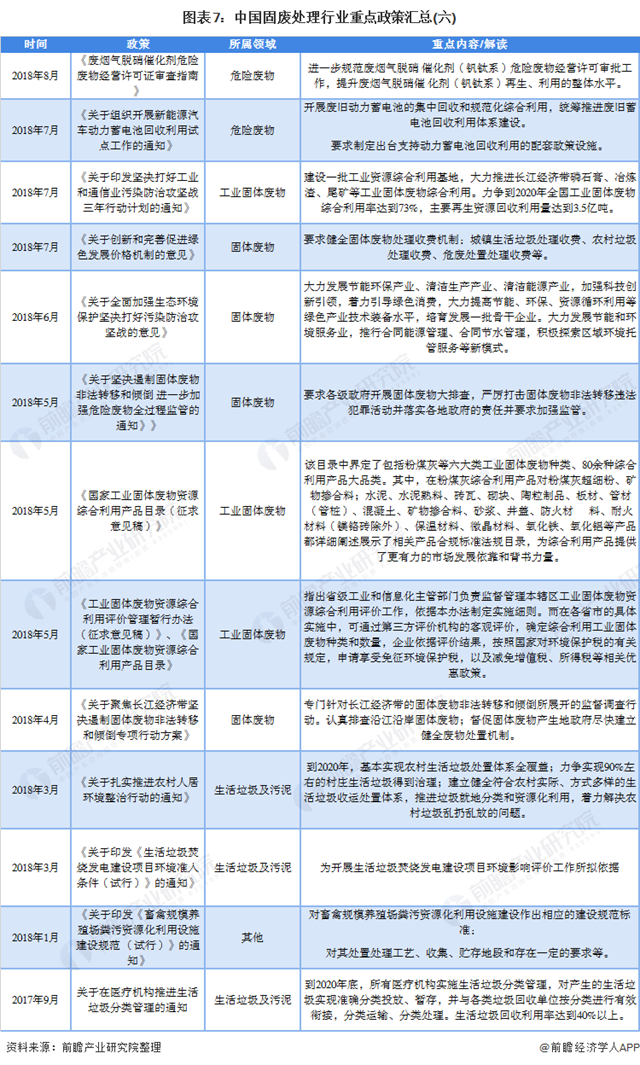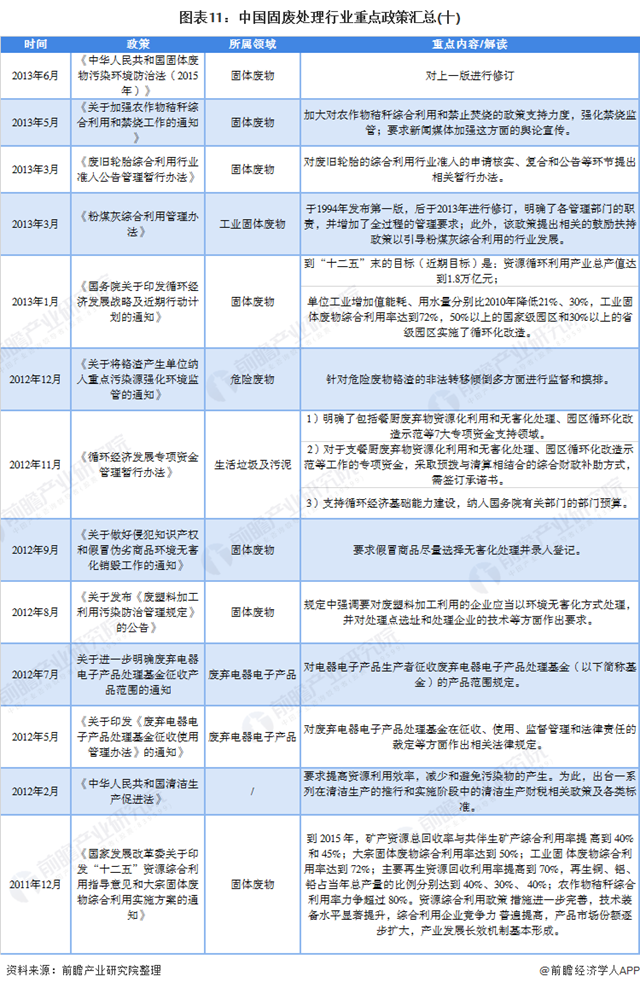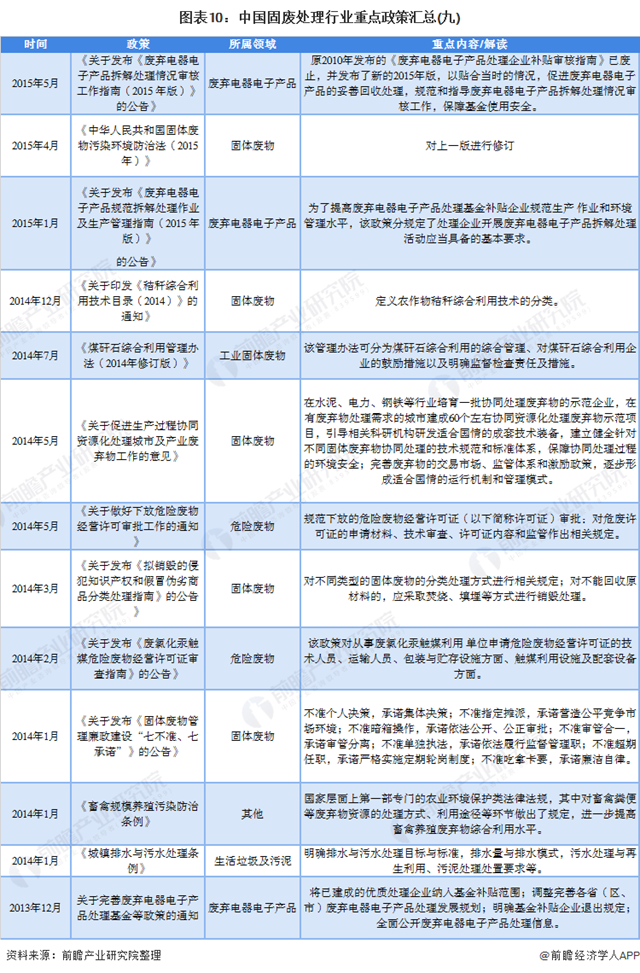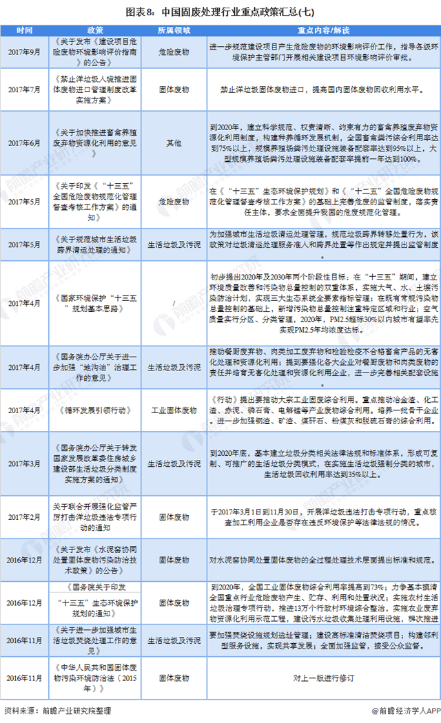 我國(guó)固廢行業(yè)相關(guān)的重點(diǎn)政策針對(duì)方面主要可分為綜合固體廢物、危險(xiǎn)廢物、工業(yè)固體廢物、廢棄電器電子產(chǎn)品、生活垃圾及污泥及其他,在該基礎(chǔ)上,針對(duì)不同方面出臺(tái)了數(shù)量相當(dāng)?shù)恼咭砸?guī)定和支持固廢處理及其相關(guān)產(chǎn)業(yè)(例如,垃圾焚燒發(fā)電等)的產(chǎn)業(yè)化發(fā)展。