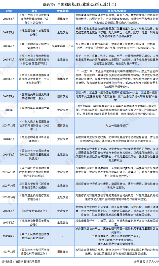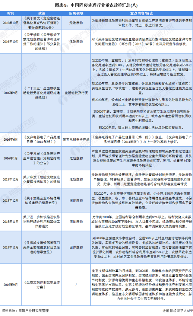從“八五”規(guī)劃開(kāi)始,我國(guó)就在國(guó)家層面戰(zhàn)略中不斷對(duì)固廢處理的概念和規(guī)劃進(jìn)行優(yōu)化。從“八五”的普遍固體廢物綜合利用的概念,到“九五”出現(xiàn)生活垃圾無(wú)害化處理, “十五”的危險(xiǎn)廢物集中處理,“十一五”的醫(yī)療廢物、廢棄電子產(chǎn)品和秸稈、農(nóng)膜、禽畜糞便等其他固體廢物,“十三五”的餐廚垃圾和建筑垃圾等一系列新的固廢概念的出現(xiàn)和分類標(biāo)準(zhǔn)的變更,給我國(guó)的固廢處理行業(yè)帶來(lái)了新的機(jī)遇與更高要求的政策標(biāo)準(zhǔn)。
