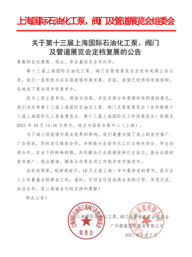 關(guān)于第十三屆上海國(guó)際石油化工泵、閥門及管道展覽會(huì)定檔復(fù)展的公告