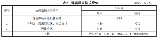 7.5 應(yīng)采取隔聲、吸聲、降噪等措施。處理系統(tǒng)產(chǎn)生的環(huán)境噪聲應(yīng)符合GB 12348、GB 3096、GB/T 50087的規(guī)定。具體指標(biāo)見(jiàn)表2。