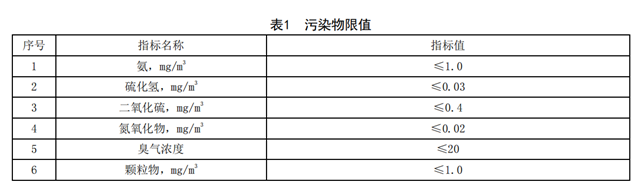 7.4 氨、硫化氫、二氧化硫、氮氧化物和臭氣濃度等惡臭污染物廠界排放限值應(yīng)符合GB 14554中惡臭污染物廠界標(biāo)準(zhǔn)相應(yīng)級(jí)別的指標(biāo)值。顆粒物應(yīng)符合GB 3095-2012表1中二級(jí)濃度限值要求。具體要求見(jiàn)表1。
