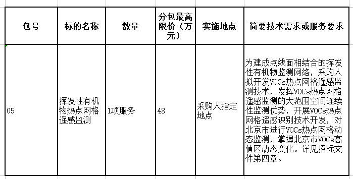 北京市揮發(fā)性有機物解析能力建設(shè)一期(中央資金)-揮發(fā)性有機物熱點網(wǎng)格遙感監(jiān)測公開招標(biāo)公告