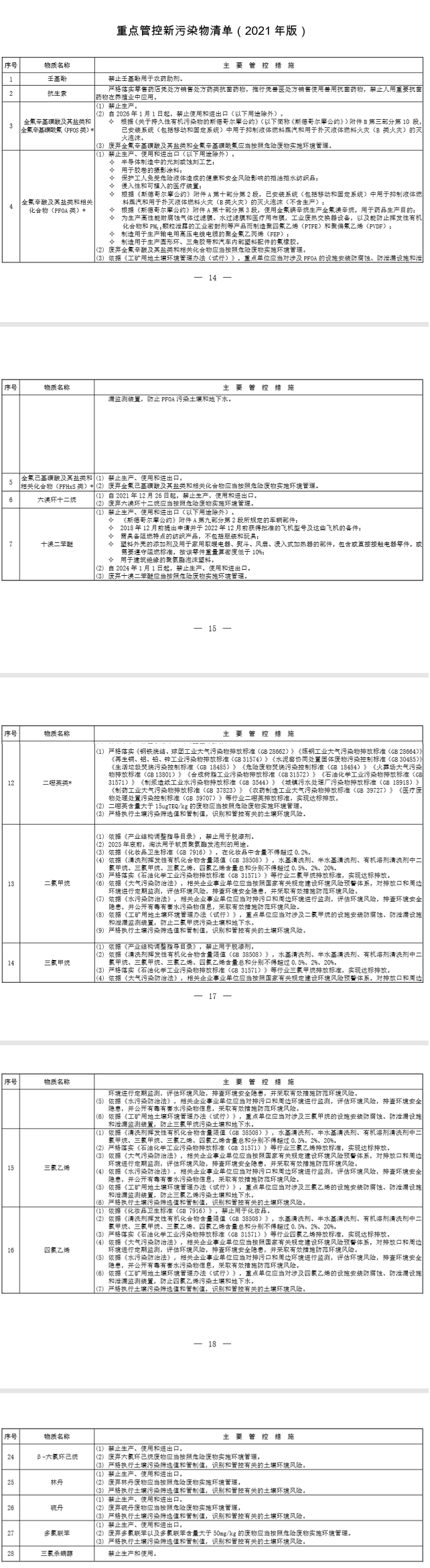 (七)動(dòng)態(tài)發(fā)布重點(diǎn)管控新污染物清單。針對(duì)列入《優(yōu)先控制化學(xué)品名錄》的化學(xué)物質(zhì),以及抗生素、微塑料等國(guó)內(nèi)外關(guān)注且環(huán)境檢出率高的其他新污染物,制定“一品一策”管控措施,開(kāi)展管控措施的技術(shù)可行性和經(jīng)濟(jì)社會(huì)影響評(píng)估,識(shí)別優(yōu)先控制化學(xué)品主要環(huán)境排放源,適時(shí)制修訂相關(guān)行業(yè)排放標(biāo)準(zhǔn),動(dòng)態(tài)更新有毒有害大氣污染物名錄、有毒有害水污染物名錄、重點(diǎn)控制的土壤有毒有害物質(zhì)名錄,研究制定禁止或限制用途的化學(xué)物質(zhì)名錄。在此基礎(chǔ)
