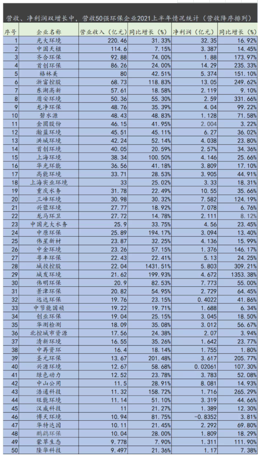 2021年上半年?duì)I收、凈利潤(rùn)雙增的企業(yè)中,營(yíng)收排在前50的企業(yè),光大環(huán)境、中國(guó)天楹、齊合環(huán)保、首創(chuàng)環(huán)保、格林美5家企業(yè),半年?duì)I收均超80億元,分別以上半年?duì)I收實(shí)現(xiàn)220.46億元、114.6億元、92.88億元、86.26億元、80億元的成績(jī)穩(wěn)居前五。