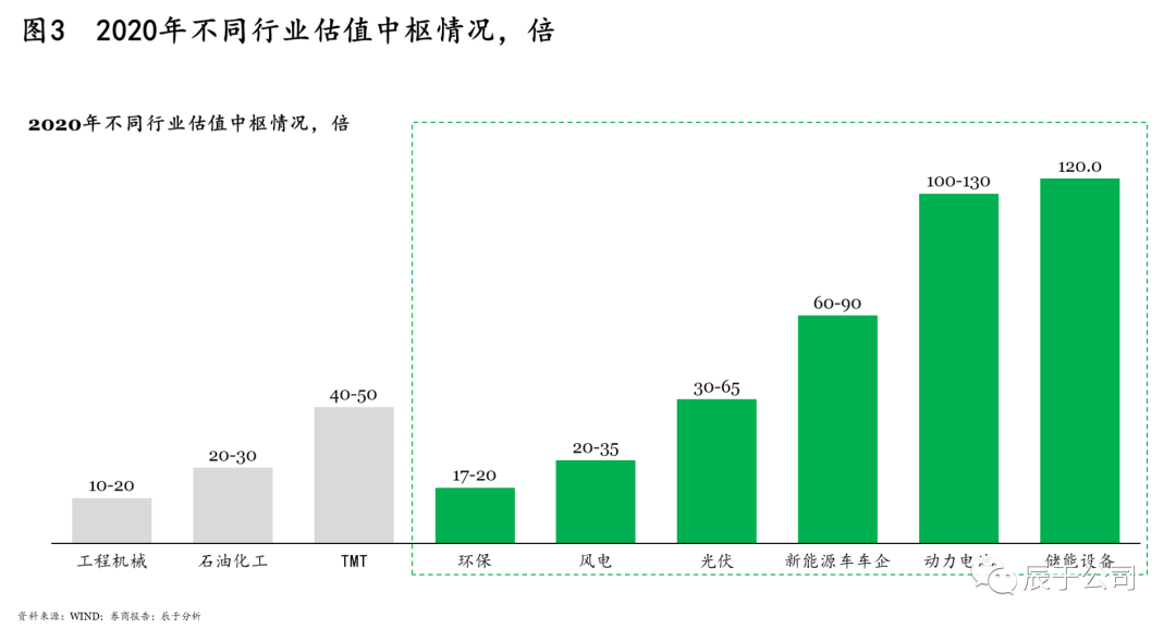 不難發(fā)現(xiàn),不同行業(yè)的估值中樞相差很大,例如能源類與生態(tài)環(huán)保類之間就相差2-6倍(圖3),因此,具有多類業(yè)務(wù)或有轉(zhuǎn)型意向的生態(tài)環(huán)保企業(yè)可在行業(yè)定性上多加考慮。