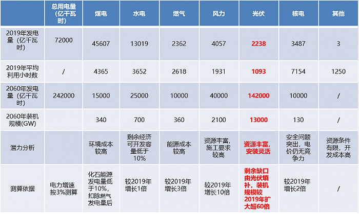 按最保守估算,電力消費年均增速3%,預計到2060年,中國電力年消費量將超過24萬億千瓦時。根據(jù)現(xiàn)在可以預測的能源相關技術,我們對發(fā)電側各能源逐項進行分析,大致如下。