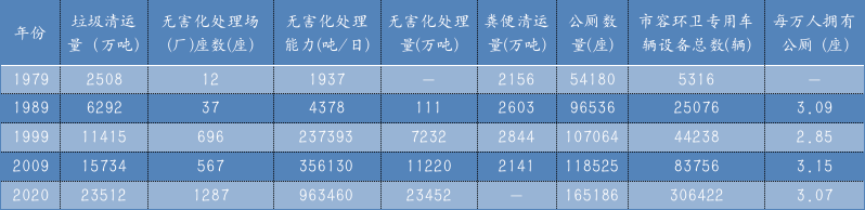 《年鑒》分別統(tǒng)計(jì)了城市、縣城和村鎮(zhèn)三部分市容環(huán)衛(wèi)大數(shù)據(jù),其中城市部分最為詳盡,包括了從1979-2020年的生活垃圾清運(yùn)量、垃圾處理場(chǎng)(廠)數(shù)量、無害化處理能力、無害化處理量、糞便清運(yùn)量、市容環(huán)衛(wèi)專用車輛設(shè)備總數(shù)、公廁數(shù)量及每萬人擁有公廁數(shù)(個(gè)別年份和統(tǒng)計(jì)項(xiàng)目空缺);縣城部分也包括上述統(tǒng)計(jì)項(xiàng)目,但日期是從2000年開始至2020年;村鎮(zhèn)部分則只有2020年數(shù)據(jù),統(tǒng)計(jì)項(xiàng)目只包含生活垃圾中轉(zhuǎn)站數(shù)量、環(huán)衛(wèi)專用車輛設(shè)備總數(shù)和公廁數(shù)量。《年鑒》顯示,2020年,全國城市生活垃圾清運(yùn)量達(dá)23,512萬噸(約2.351億噸),總計(jì)擁有1287座無害化處理場(chǎng)(廠),生活垃圾處理能力963,460.15噸/日(約96.35萬噸/日),年無害化處理生活垃圾23,452萬噸(約2.345億噸)。全國城市擁有165,186座(約16.52萬座)公廁,平均每萬人擁有3.07座公廁,全國城市共擁有環(huán)衛(wèi)專用車輛設(shè)備306,422輛(約30.64萬輛)。表1 1979-2020年全國城市市容環(huán)衛(wèi)總體情況(大致按年代跨度)