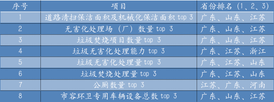 2、2020年環(huán)衛(wèi)設(shè)施投資大提速2020年市容環(huán)衛(wèi)和垃圾處理基礎(chǔ)設(shè)施固定資產(chǎn)投資1568.4億元,其中市容環(huán)衛(wèi)投資862.6億元,垃圾處理設(shè)施投資705.8億元,這兩個(gè)數(shù)字較2019年增長了54.75%和73.50%,目測(cè)是10年來增速最快的一年。環(huán)衛(wèi)真的是朝陽產(chǎn)業(yè)??!3、有的省在環(huán)衛(wèi)和垃圾處理固定資產(chǎn)投資為0上文提到固定資產(chǎn)投資,全國花了1568個(gè)億,但也有個(gè)別省份交了白卷,例如西藏,在這兩方面的投資均為0,而青海,雖然在市容環(huán)衛(wèi)設(shè)施方面花了1個(gè)多億,但垃圾處理基礎(chǔ)設(shè)施投資也是0.有0就有top 5,2020年,在市容環(huán)衛(wèi)設(shè)施方面投資最大的省份是:廣東(102.2億)、江蘇(93.5億)、浙江(61.4億)、河南(59.4億)、河北(57.1億),垃圾處理設(shè)施建設(shè)方面投資最大的省份是:廣東(97.3億)、江蘇(84.6億)、浙江(53.8億)、河北(49.7億)、河南(48.3億)。是的,你沒看錯(cuò),前三沒有變化,只有第四和第五位是河南、河北在移形換位。如果沒有特殊情況,未來幾年內(nèi),這五個(gè)省的環(huán)衛(wèi)和垃圾處理設(shè)施投資會(huì)繼續(xù)名列前茅,相關(guān)企業(yè)需要重視了!4、全國市容環(huán)衛(wèi)實(shí)力哪家強(qiáng)?表5 全國市容環(huán)衛(wèi)行業(yè)主要指標(biāo)排名前三位省份