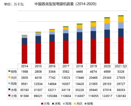 新能源的發(fā)展是《方案》中著力描寫的重要篇章。對(duì)于風(fēng)電與太陽能發(fā)電,所采取的原則是“全面推進(jìn)”;對(duì)于水電,開發(fā)的原則是“因地制宜”;對(duì)于核電,需要“積極安全有序發(fā)展”。此外,生物質(zhì)發(fā)電、地?zé)崮芤约安ɡ四?、潮流能、溫差能等新能源的開發(fā)利用也有所提及,也將成為我國近十年內(nèi)探索發(fā)展的重要領(lǐng)域。國家能源局最新數(shù)據(jù)顯示,截至2021年第3季度末,我國風(fēng)電和太陽能發(fā)電合計(jì)裝機(jī)容量合計(jì)5.8億千瓦,距離《方案》中要求的到2030年風(fēng)光發(fā)電總裝機(jī)容量達(dá)到12億千瓦以上還有超過一倍的差距。未來十年,風(fēng)光發(fā)電的裝機(jī)容量需要達(dá)到每年近8.5%的增長,水電需要在十四五和十五五期間分別新增4000萬千瓦裝機(jī),對(duì)應(yīng)現(xiàn)有水電裝機(jī)容量合計(jì)共增長近20%,才能滿足我國碳達(dá)峰行動(dòng)方案的目標(biāo)要求。