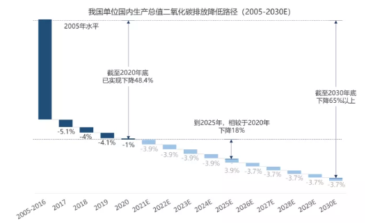 *圖內(nèi)數(shù)據(jù)為各年度我國單位GDP二氧化碳排放量同比變化的實(shí)際值和預(yù)測值。歷史數(shù)據(jù)來源于中華人民共和國2017-2020年國民經(jīng)濟(jì)和社會(huì)發(fā)展統(tǒng)計(jì)公報(bào)、生態(tài)環(huán)境部,預(yù)測數(shù)據(jù)由中財(cái)大綠金院根據(jù)《2030年前碳達(dá)峰行動(dòng)方案》推算得出。