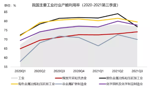 對(duì)于工業(yè)領(lǐng)域的碳達(dá)峰行動(dòng),除了在節(jié)能降碳增效環(huán)節(jié)提到的推動(dòng)鋼鐵、有色金屬、建材、石化化工等行業(yè)開展節(jié)能降碳改造之外,《方案》對(duì)于重點(diǎn)行業(yè)的碳達(dá)峰行動(dòng)還進(jìn)行了詳細(xì)規(guī)劃。整體的思路為優(yōu)化產(chǎn)業(yè)結(jié)構(gòu),加快退出落后產(chǎn)能。其中鋼鐵行業(yè)是“嚴(yán)格執(zhí)行產(chǎn)能置換,嚴(yán)禁新增產(chǎn)能,推進(jìn)存量優(yōu)化,淘汰落后產(chǎn)能”,有色金屬行業(yè)是“嚴(yán)格執(zhí)行產(chǎn)能置換,嚴(yán)控新增產(chǎn)能”,建材行業(yè)是“加強(qiáng)產(chǎn)能置換監(jiān)管,加快低效產(chǎn)能退出,嚴(yán)禁新增水泥熟料、平板玻璃產(chǎn)能”,石化化工行業(yè)是“優(yōu)化產(chǎn)能規(guī)模和布局,加大落后產(chǎn)能淘汰力度,嚴(yán)格項(xiàng)目準(zhǔn)入”,體現(xiàn)了不同領(lǐng)域側(cè)重略有不同,但均為嚴(yán)格準(zhǔn)入、控制產(chǎn)能的行動(dòng)方案。從我國目前主要工業(yè)的產(chǎn)能利用率情況來看,《方案》所提及的相關(guān)行業(yè)的產(chǎn)能利用率在2020年來均處于85%以下的水平,最近2021年第三季度基本處于70%-80%區(qū)間,呈現(xiàn)中輕度的產(chǎn)能過剩的現(xiàn)象。由于工業(yè)是產(chǎn)生碳排放的主要領(lǐng)域之一,淘汰落后過剩產(chǎn)能,實(shí)現(xiàn)工業(yè)產(chǎn)能的轉(zhuǎn)型優(yōu)化,將是助力我國碳達(dá)峰的重要工作之一。