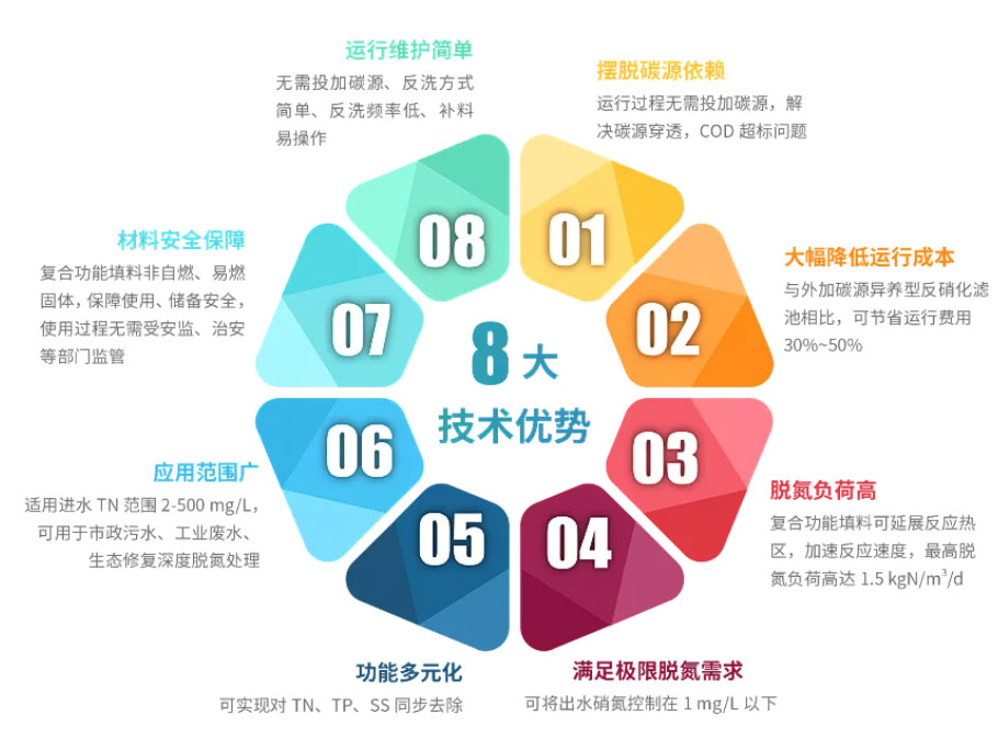 而通過對復合活性生物載體中硫、鐵及其他活性組分進行優(yōu)化設(shè)計,則能促使附著其上的功能微生物形成代謝偶聯(lián)網(wǎng)絡(luò),實現(xiàn)高生物持有量、長距離電子傳遞,進而獲得高負荷脫氮能力,徹底擺脫對碳的依賴。▼SADeN®技術(shù)8大核心優(yōu)勢