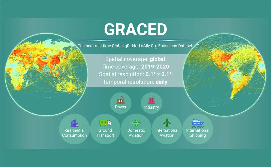 本研究提出了一種基于近實時碳排放量化方法和參數模型的碳排放空間表征模式,基于衛(wèi)星遙感數據、地面監(jiān)測數據與統(tǒng)計數據等多源數據耦合的云計算平臺,以高時空精度(天尺度,0.1度柵格)和高時效(近實時更新:僅滯后約一個月)方式進行全球碳排放空間量化展示,構建以天為單位的(自2019年1月1日起)全球首個近實時天尺度碳排放地圖—Global gRidded dAily CO2 Emissions Dataset(GRACED),為全球碳排放動態(tài)監(jiān)測及政策評估提供了重要的數據支撐。相關工作以“近實時全球網格級天尺度碳排放”(Near-real-time global gridded daily CO2 emissions)為題,在Cell Press 合作期刊《The Innovation》上在線發(fā)表。