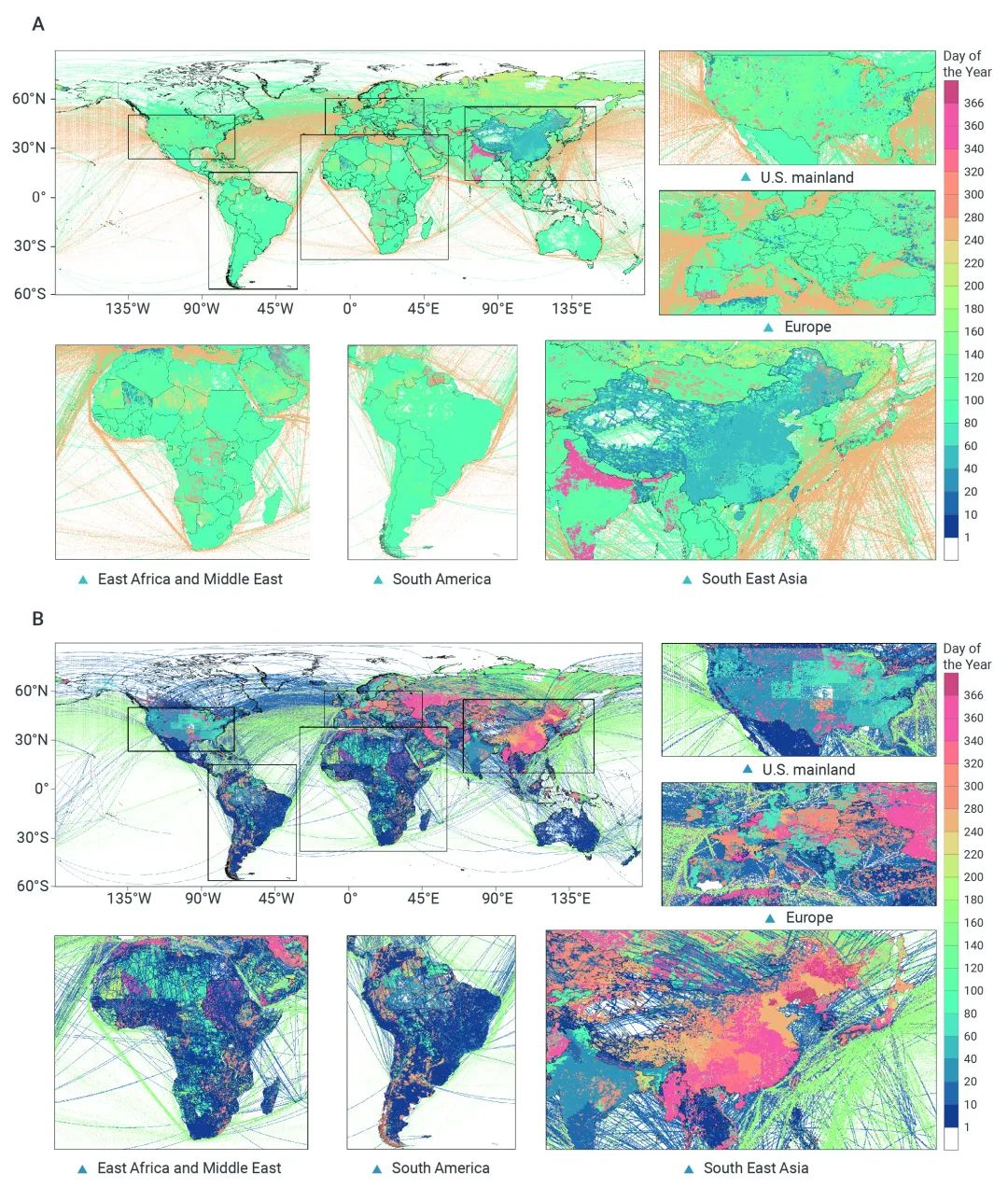 GRACED反映了全球不同區(qū)域受疫情影響排放大幅下降時間和后期經濟復蘇排放顯著反彈時間的差異(圖6)。圖6A展示了全球不同區(qū)域最大碳排放降幅日的碳地圖,圖6B展示了最大反彈日的碳地圖。顏色越紅表明出現時間越晚。