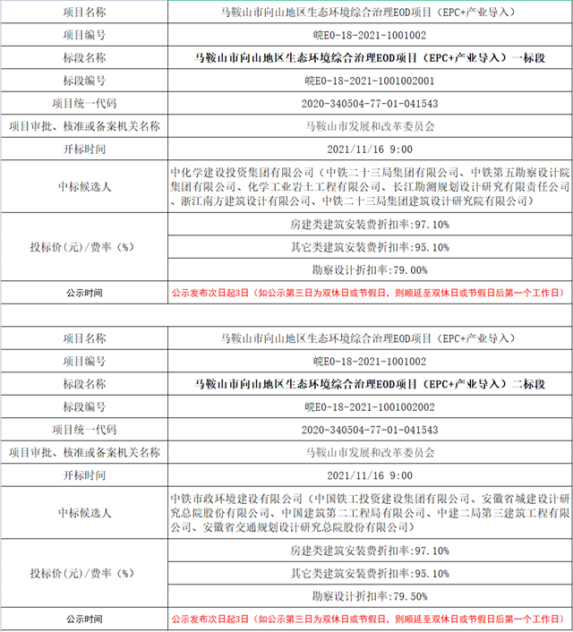 2021年11月17日,馬鞍山市公告資源交易中心發(fā)布《馬鞍山市向山地區(qū)生態(tài)環(huán)境綜合治理EOD項目(EPC+產業(yè)導入)項目中標公示》。
